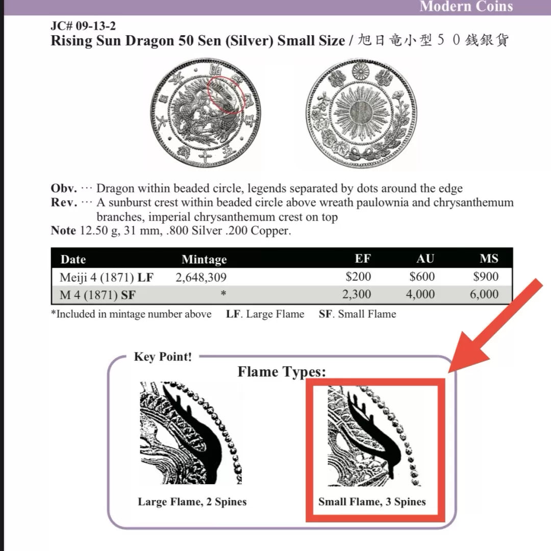 The “3 Spines” subtype (JNDA 01-13A) shows a distinct die variety in the dragon’s tail, featuring three small spines and a compact flame motif.