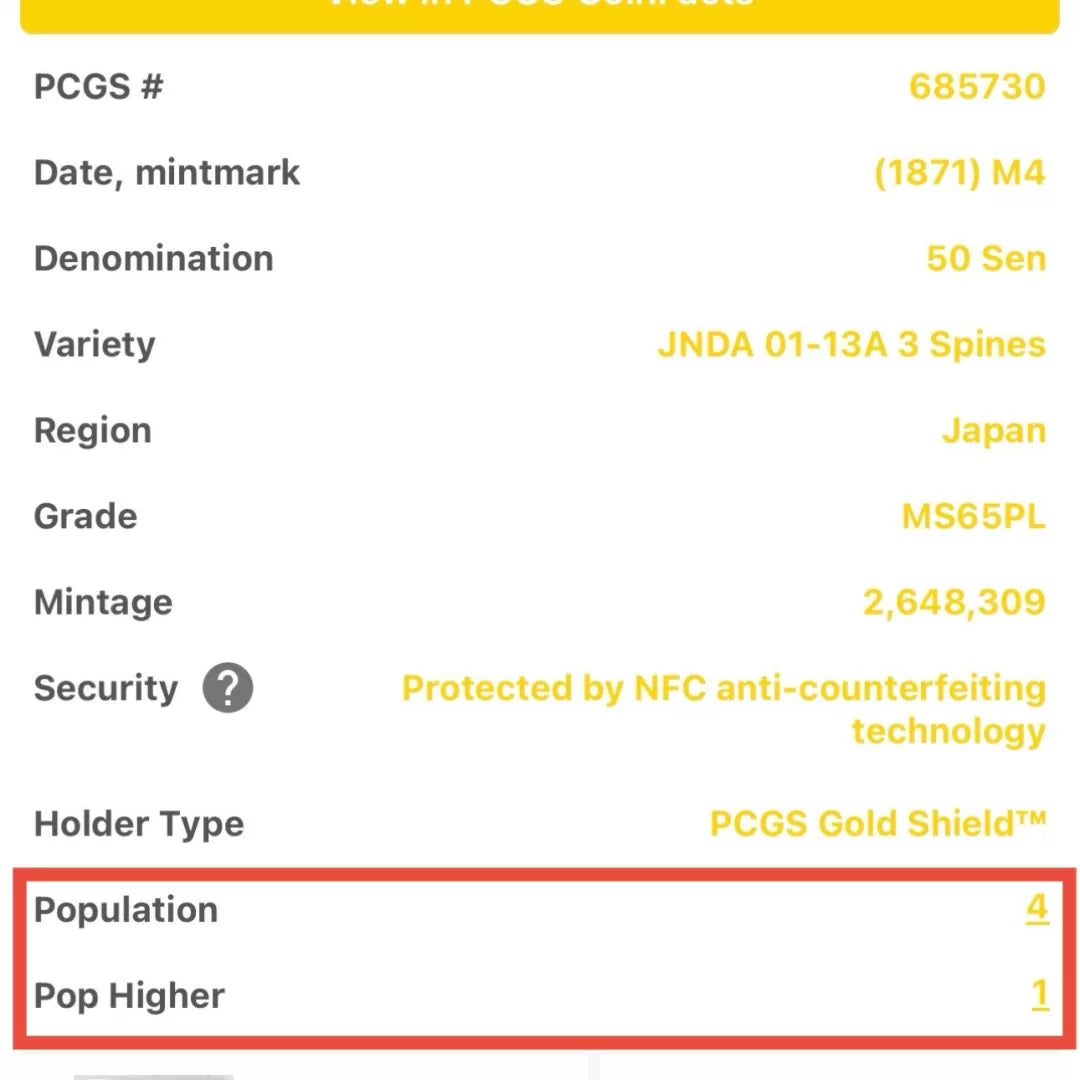 Prooflike (“PL”) examples of Meiji-era 50 Sen coins are seldom encountered in any subtype. Even for later issues — such as the Meiji 37 (1904) 50 Sen — highest-grade PL coins have realized over ¥1,000,000, demonstrating the strong premium collectors place on reflective-surface specimens.