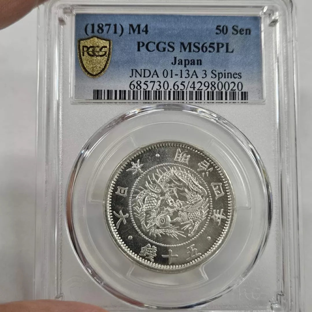 | ●This is an extraordinary early-Meiji silver half yen, struck in 1871 (Meiji 4) — one of Japan’s very first standardized silver issues following the country’s modernization of its minting system.Certified PCGS MS65 Prooflike (PL), this coin displays deep mirror fields and frosted design elements rarely preserved to such a degree.