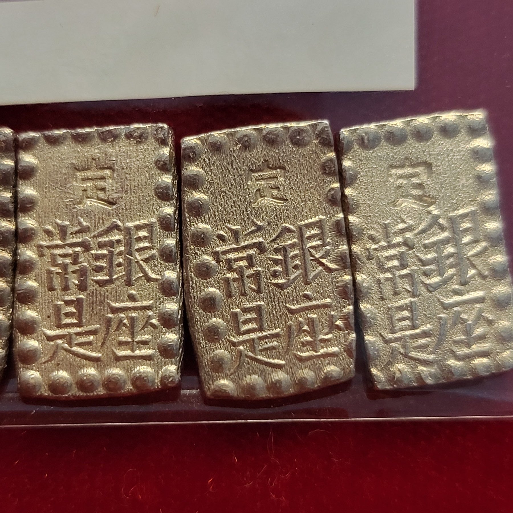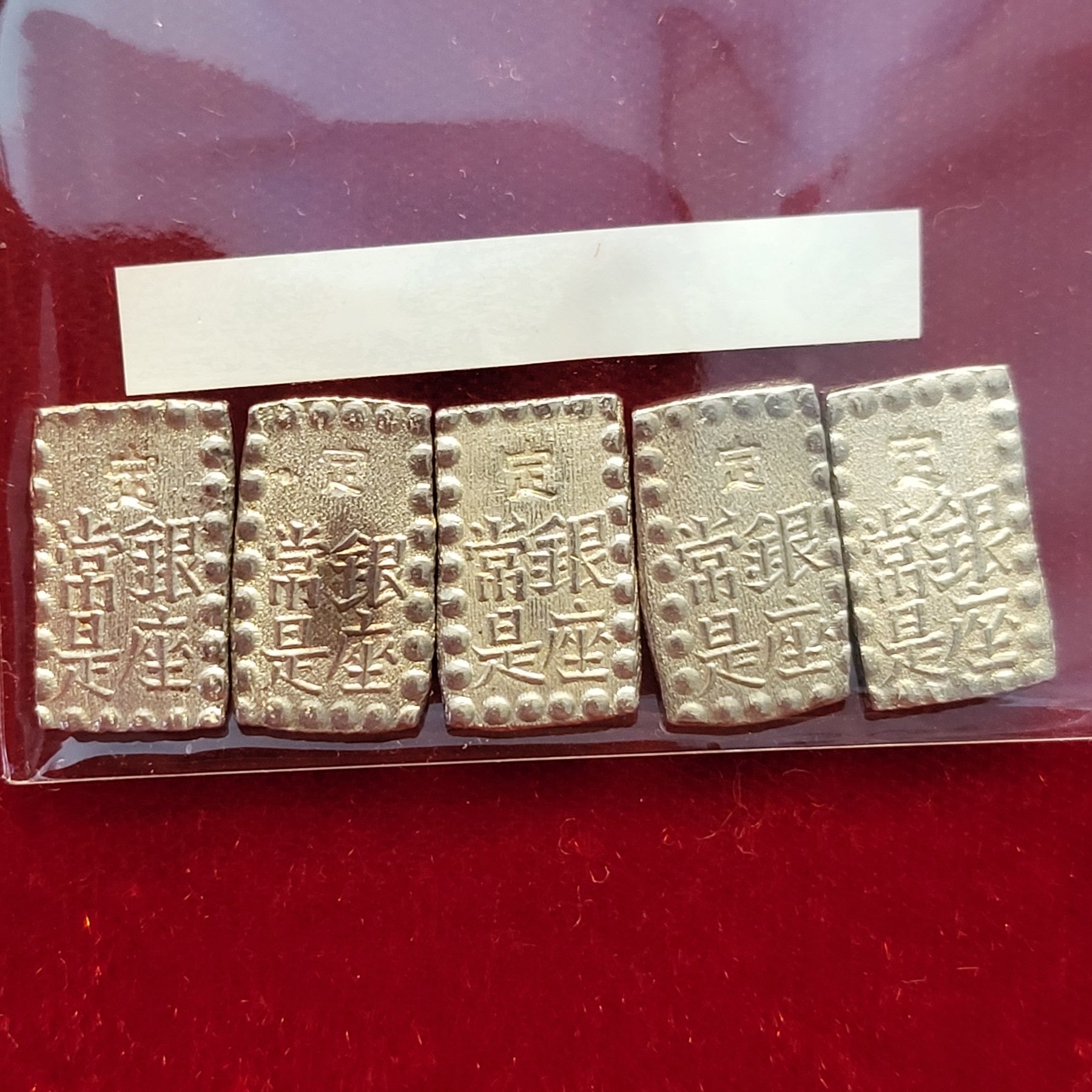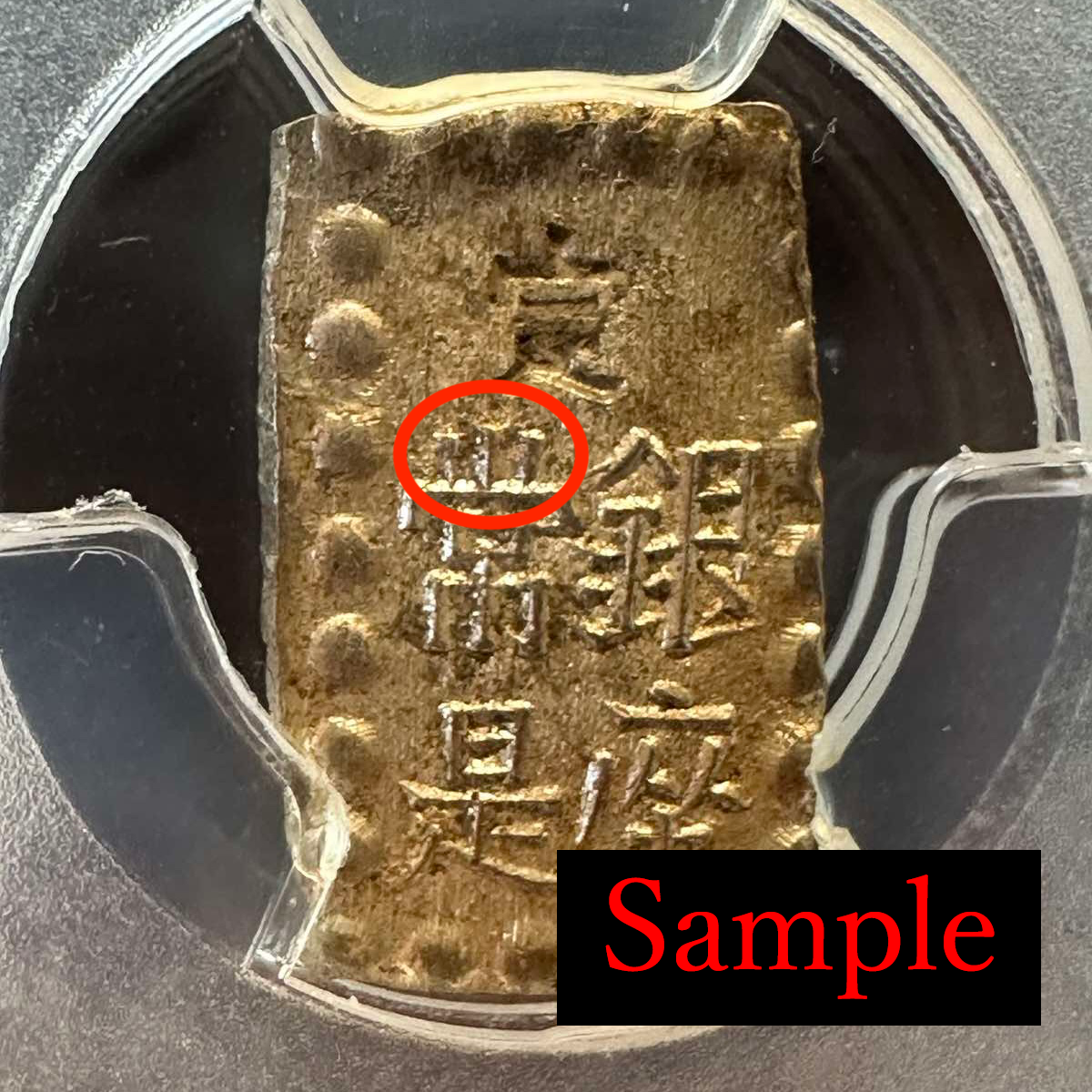 ●Try to compare 5 coins with the one in the slub case. You will understand those 5 coins are in extremely well condition. The sample coin is the Meiji 1 Shu Silver, which is extremely similar to the Kaei 1 shu Silver. You can take a look at the red circle of the sample coin, that is the point to distinguish either Kaei or Meiji 1 Shu Silver. If the three strokes converge to the bottom center then it is "Kaei". If the three strokes are verticle lines then it is "Meiji". |
